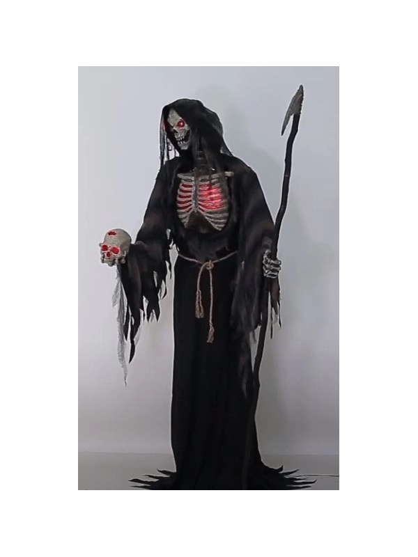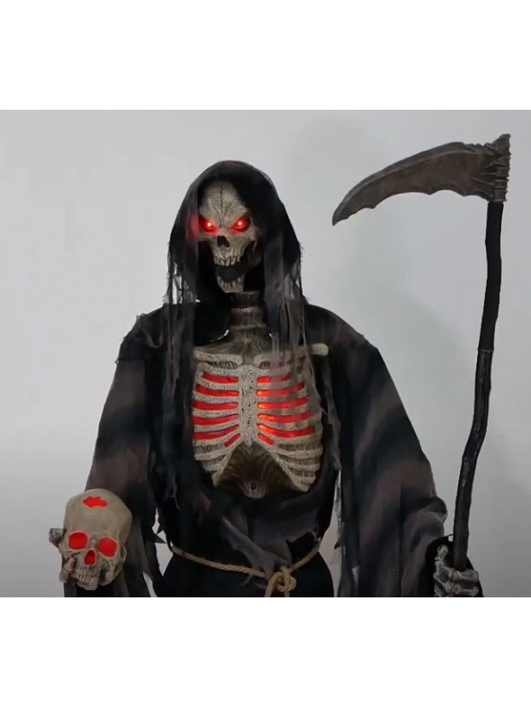 La faucheuse porte une faux à une main et dans l’autre un crane humain. Son torse, ses yeux et le crane s’éclairent d’une lumière rouge feu ; elle bouge de droite à gauche, son visage ainsi que sa mâchoire s’articulent lorsqu’elle parle. C’est exceptionnel comme qualité, cette faucheuse est magnifique.