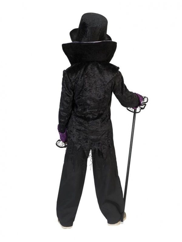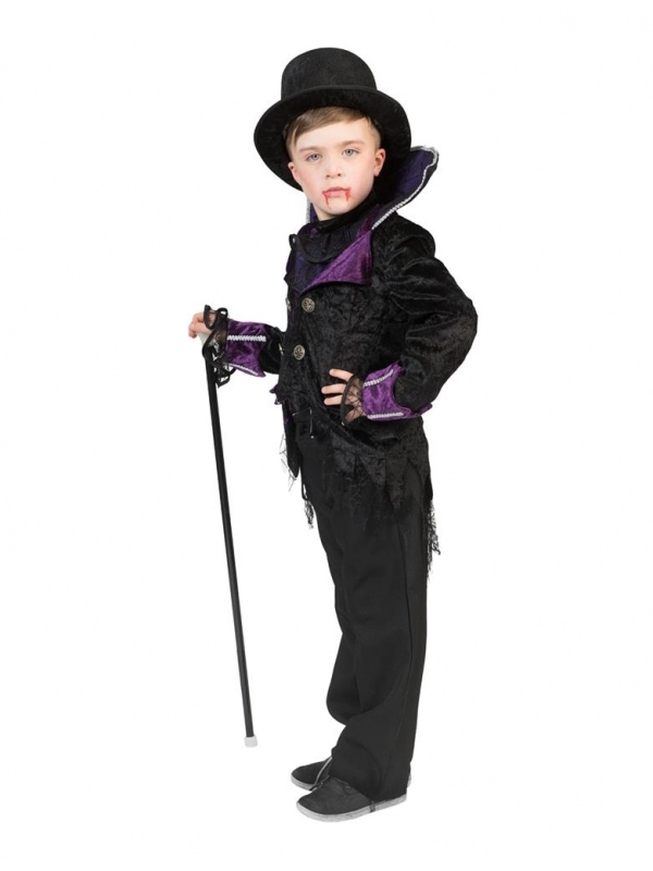 Notre déguisement de vampire pour garçon comprend une veste queue de pie aspect velours doux en polyester. La veste est noire avec un col renforcé et des points ornés de galon violet. Elle se ferme à l’avant avec une fermeture éclair et est ornée de boutons métalliques. Le bas de la veste et les manches sont prolongés par de la dentelle noire, ajoutant une touche d’élégance à ce costume de vampire. Le déguisement comprend également un jabot noir en dentelle pour compléter l’ensemble. Veuillez noter que le pantalon n’est pas inclus, mais il peut être associé avec un pantalon noir ou même un jeans noir pour un look complet.