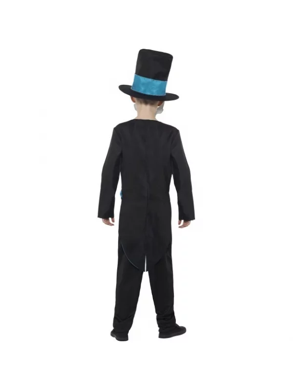 Le Déguisement jour des morts, petit marié de votre petit gamin sera complétée par un chapeau haut de forme noir avec une parure bleue en satin ainsi qu’un masque un petit peu horrible de crâne de mort.