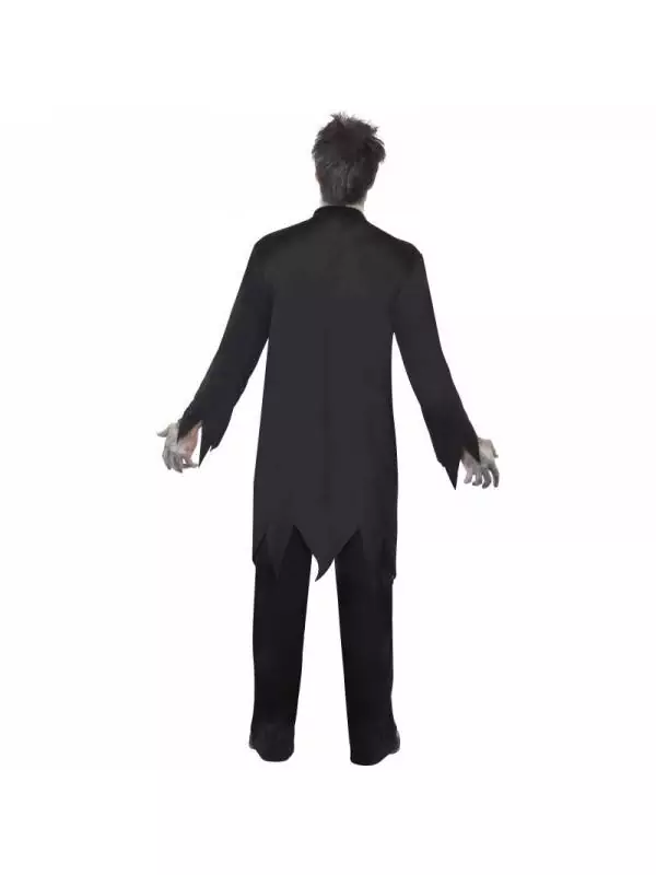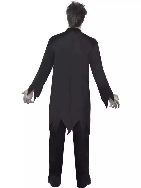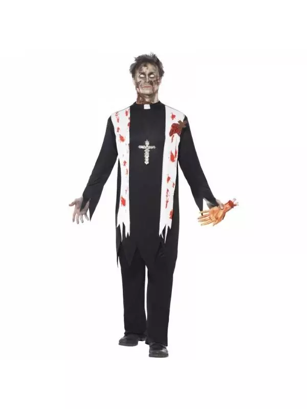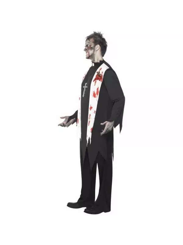 Tout d’abord, découvrez notre déguisement de prêtre zombie, il se compose d’une tunique noire et d’un pantalon assorti et d’une écharpe blanche déchiquetée et tachée de sang pour compléter le look. Assurez-vous que le déguisement soit de la bonne taille pour vous, il est décliné en tailles M et L.