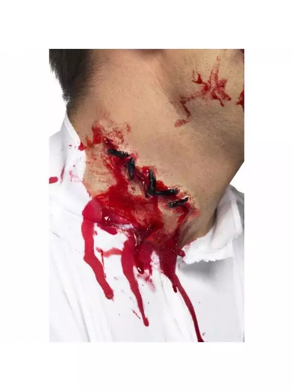 Cette fausse cicatrice qu’on met sur le cou peut donner l’impression que vous avez été égorgé. On applique du latex sur les bords afin que les effets soient plus réalistes.
