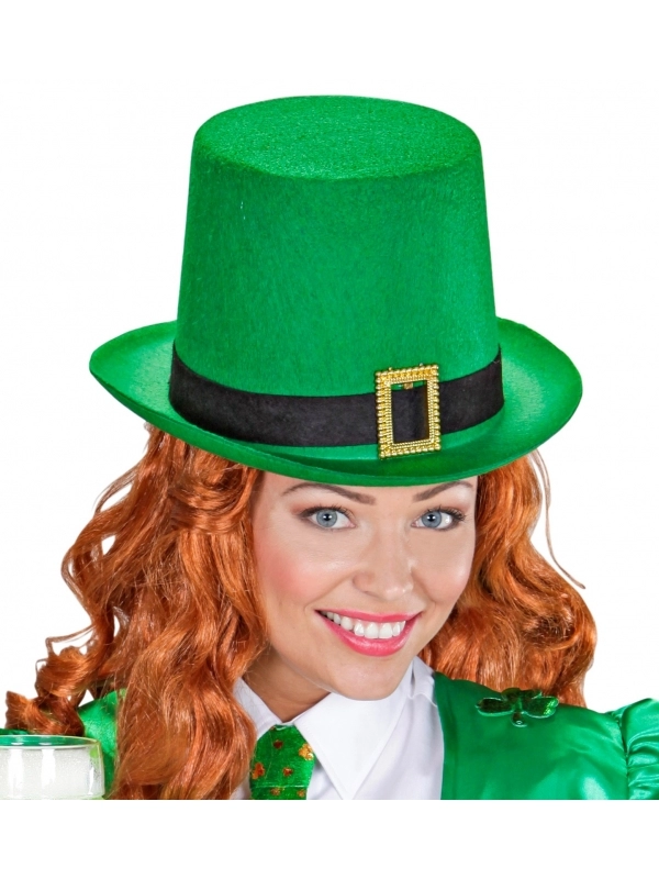 Chapeau Haut de forme vert, Saint-Patrick avec ruban noir et boucle dorée pour la Saint-Patrick.