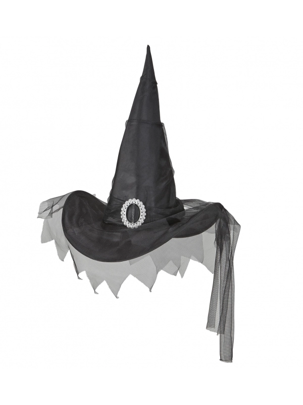 Chapeau Sorcière femme, noir avec voile et boucle argentée.