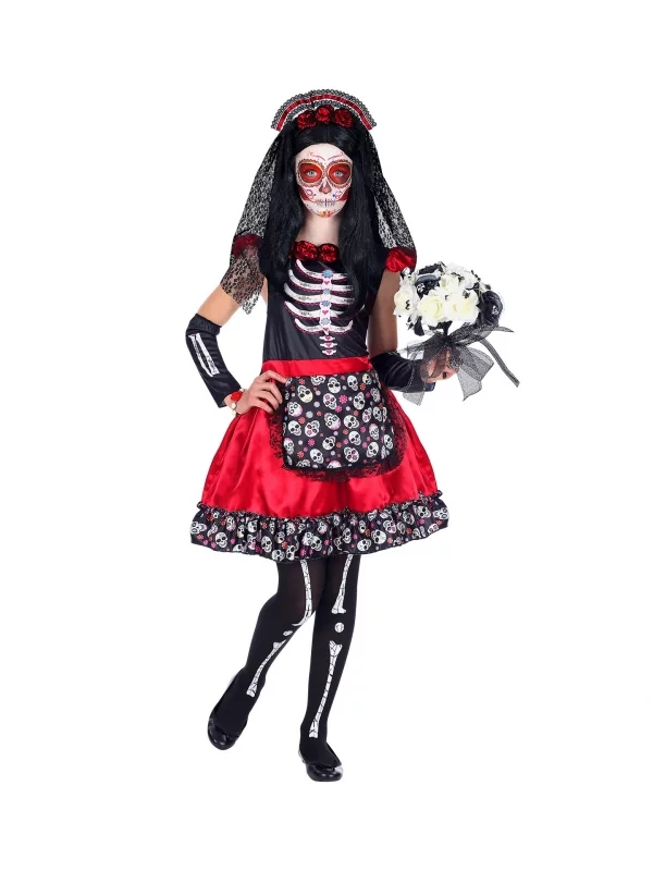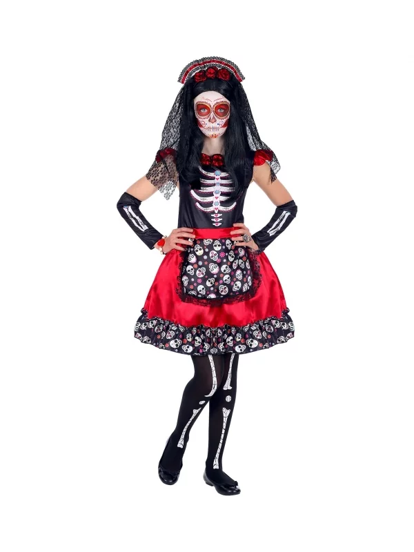 Cette robe rouge et noire à jupe évasée, ornée d’images d’un squelette et de têtes de mort, va surprendre bien du monde. Dans cette tenue, accompagnée de chauffe-bras et d’un serre-tête à voile noir style Jour des morts à la mexicaine, votre fille ne ressemblera à aucune autre. Faites-lui un maquillage squelette ou dans un ton sombre, pour obtenir une métamorphose inégalée dans des cadres déguisés !