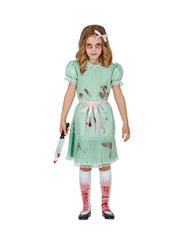 Nouveauté Halloween! Et si vous incarniez l’originalité avec ce déguisement de poupée tueuse vintage ? La robe est vert pastel avec un volant plissé et de la dentelle fine sur les bordures. Le déguisement comprend également, un noeud pour les cheveux et une paire de chaussettes, le tout est taché de sang.