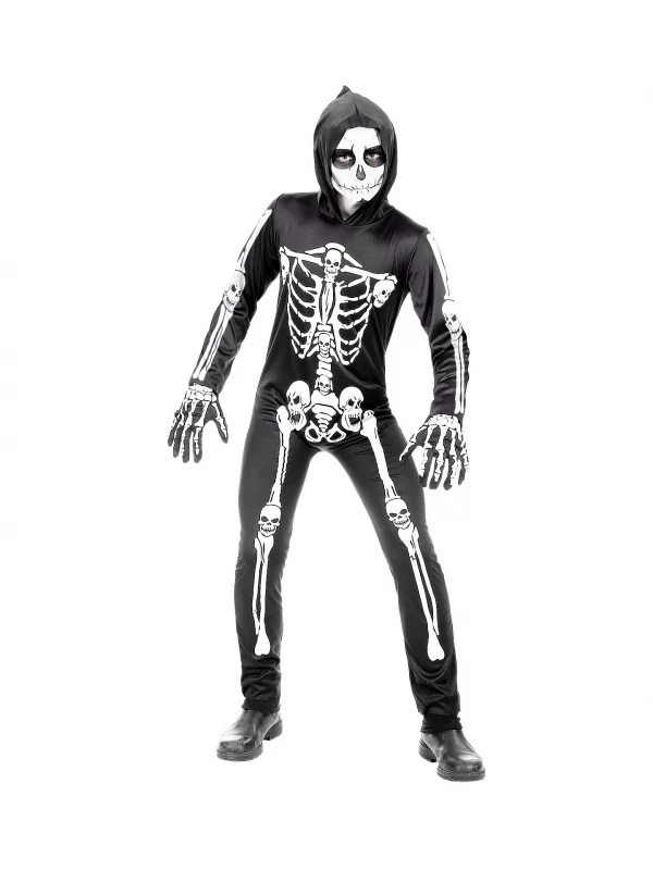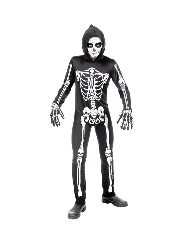 Une combinaison noire avec une capuche et un motif blanc qui vient dessiner tous les os du corps humain.