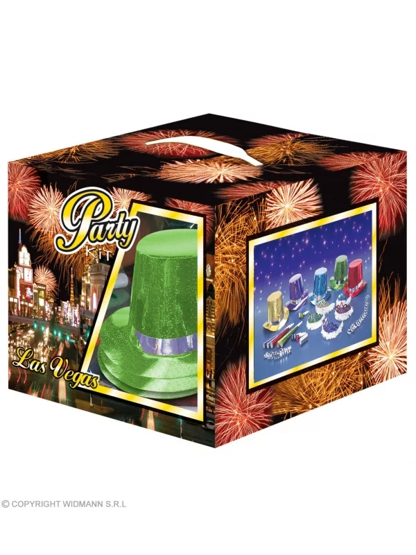 Le Kit de fête multicolore, holographique pour 10 personnes contient : 5 hauts de formes, 5 couronnes, 5 sans gênes, 5 trompettes et 1 rouleau de 10 serpentins décoratifs.
