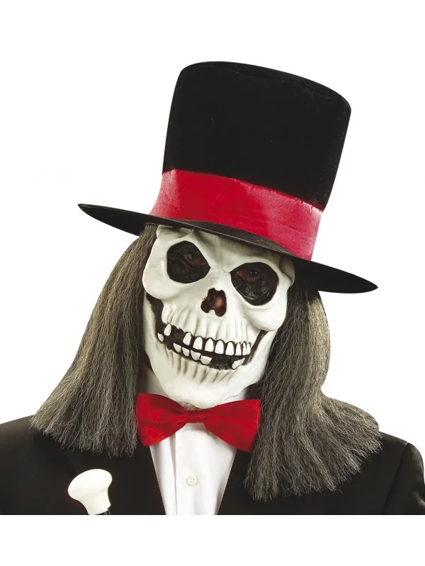 Masque squelette en latex avec Haut de forme en velours et cheveux longs